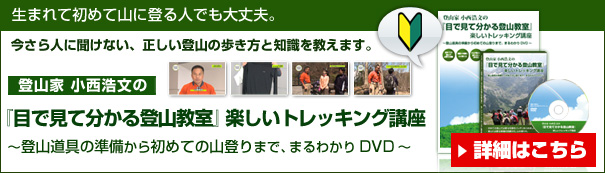 このサイトでは、登山家 小西浩文さん監修の、登山道具の準備から初めての山登りまでの全てが分かるトレッキング講座DVDをご紹介しています。